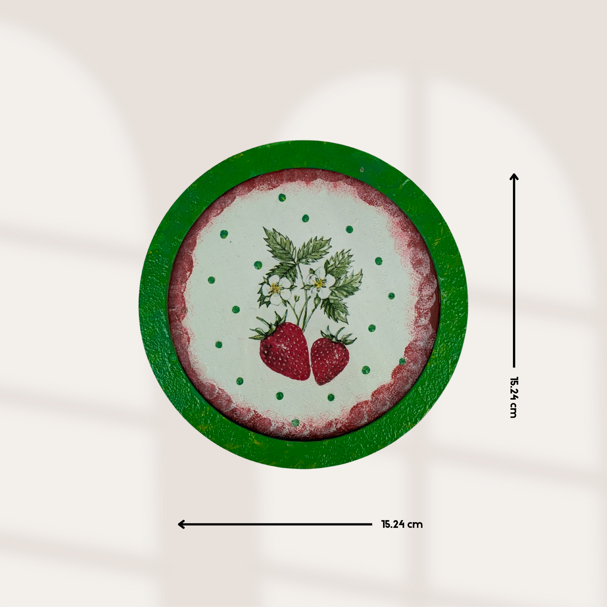 Bring home a slice of the countryside with this charming set of two MDF wall plates with acrylic glass. The large plate, featuring a rich red border, showcases a picturesque tulip and strawberry farm vibe, evoking warmth and freshness. The small plate, with a vibrant green border, highlights two ripe strawberries with delicate leaves, adding a touch of nature’s sweetness to your space.
