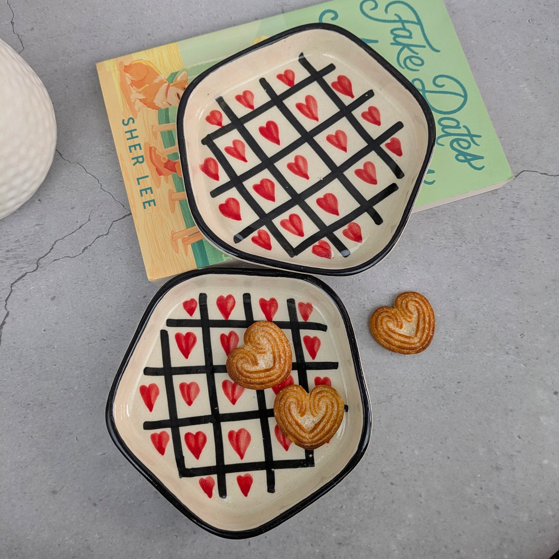 A little plate with a lot of heart. This hand-painted ceramic dish features a bold black grid filled with bright red hearts—playful, charming, and totally gift-worthy.